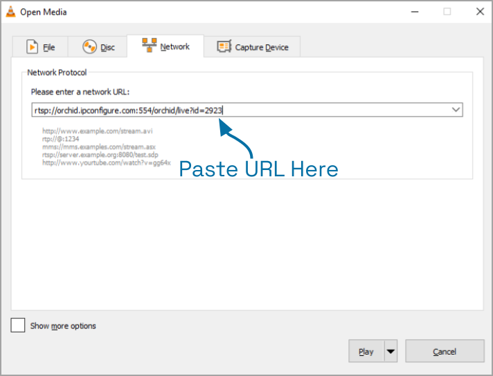 - In the Please enter a network URL field, enter the Primary Stream Proxy RTSP URL for the camera you want to stream and enter the camera’s RTSP credentials — these are the credentials you used when you registered the camera to Orchid Core VMS.