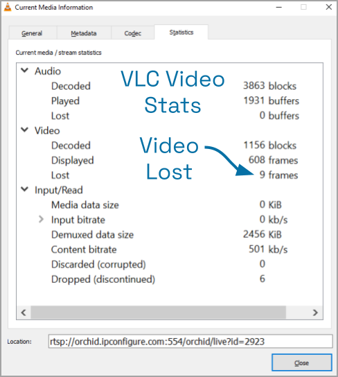In this example, only 9 frames were lost after streaming for a few minutes. This is acceptable and will not prevent video display. However, if the number of lost frames is steadily increasing over a period of 30 seconds or more (as opposed to an isolated burst), there is a network issue that will prevent our software from successfully displaying video.