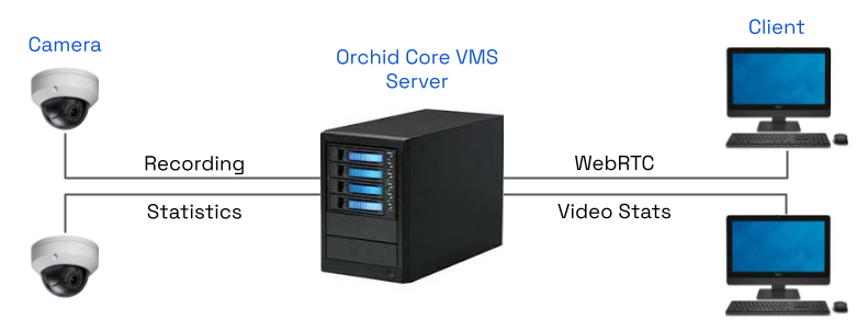 If video in Orchid Core VMS is unavailable or degraded, you may be experiencing packet loss in one of two locations: either between the camera and Orchid Core VMS, or between Orchid Core VMS and the viewing client. The diagram below indicates which check methods are available to test the different connections.