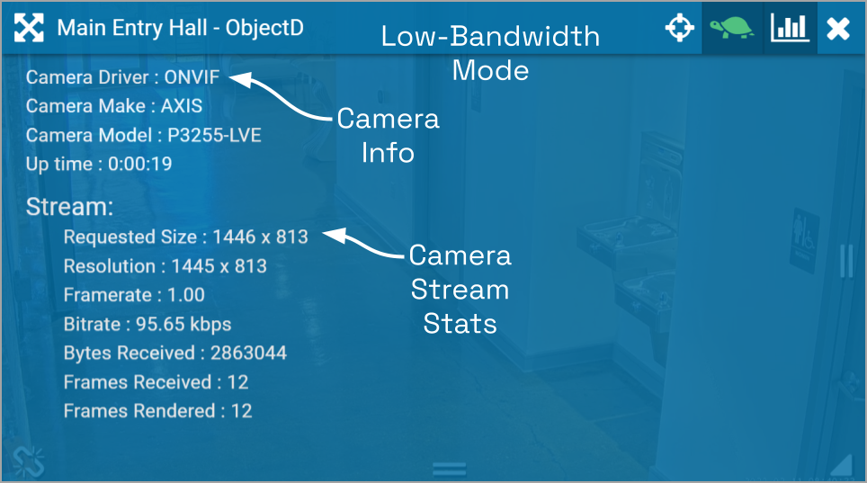 In Low-bandwidth mode, the statistics overlay will display a few details about the camera and performance. A comparison of the frames received and the frames rendered should give some indication of how well the video is decoded.