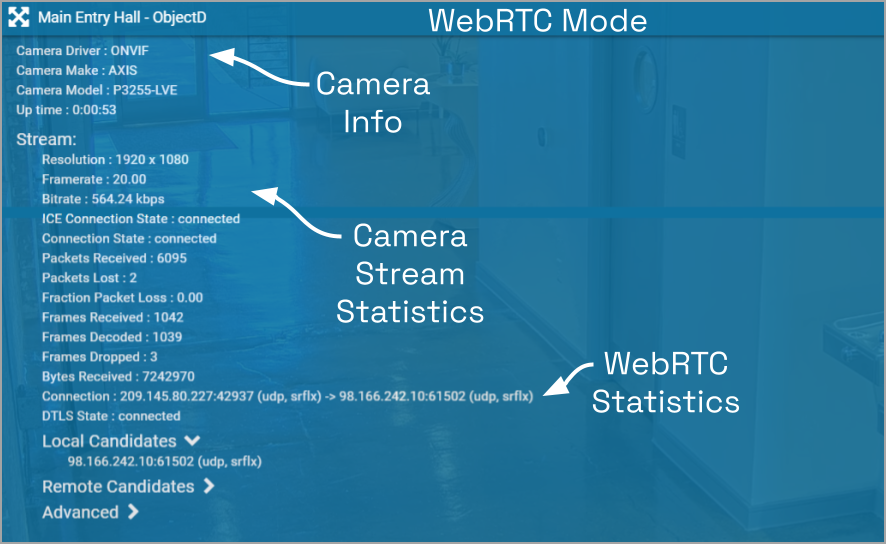 WebRTC mode delivers an expanded list of statistics, which include frames received, decoded, and dropped, plus packets received, and packets lost. If the packets lost stat increases continuously over a period of 30 seconds or more (versus an isolated burst), there may not be sufficient bandwidth between the Orchid Core VMS server and the Orchid Core VMS client.