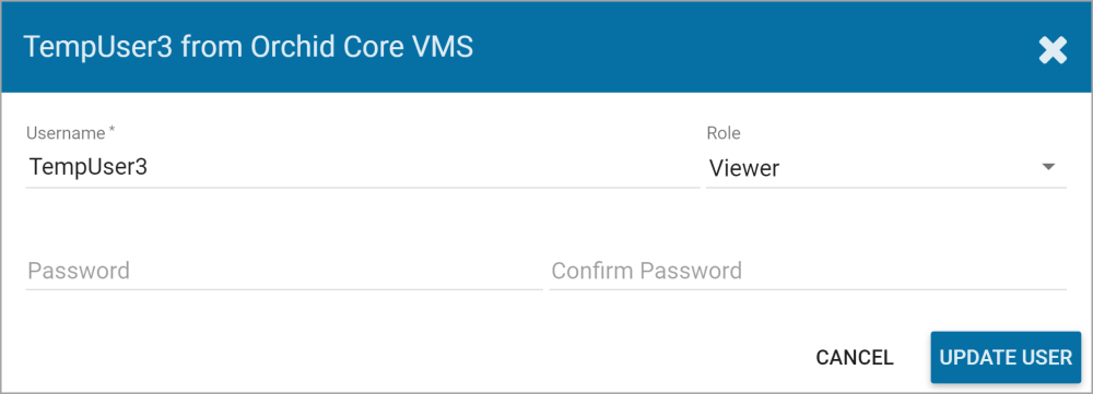Nothing is set in stone for Orchid Core VMS users and almost all of the user settings can be updated, as needed. The only user that cannot be completely edited is the default admin user (which has a Lock icon in place of the Trash Can icon). While the password can be updated, the username and role cannot be changed.