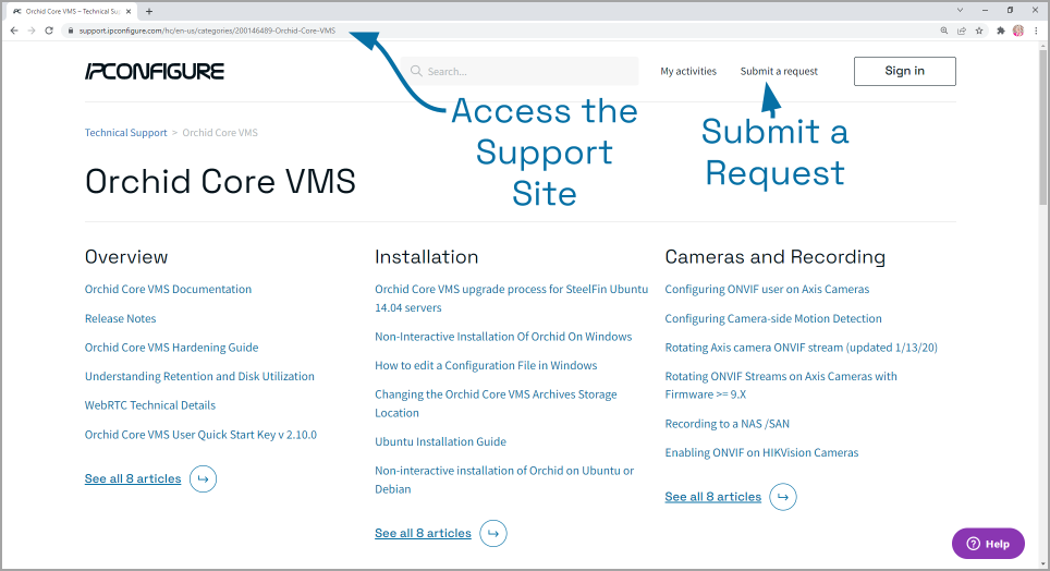 1. Enter your contact information, a description of your question/problem, the version number of your Orchid Core VMS software, your Orchid Core VMS server type, and IPConfigure SteelFin server serial number (if applicable). Please provide as much detail as possible about the problem and attach screenshots and system logs (if available).