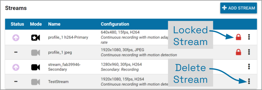 - To remove a single camera stream, go to the Streams List for a given camera and identify the stream you want to delete.