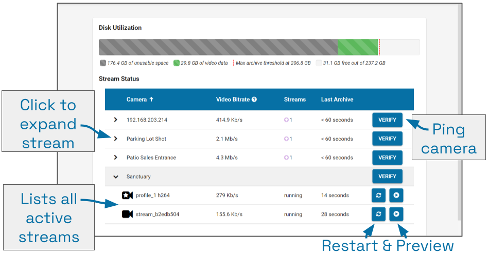 Each camera will display a Primary stream, and may also list one or more Secondary streams. The video bitrate will be listed for each of these streams.