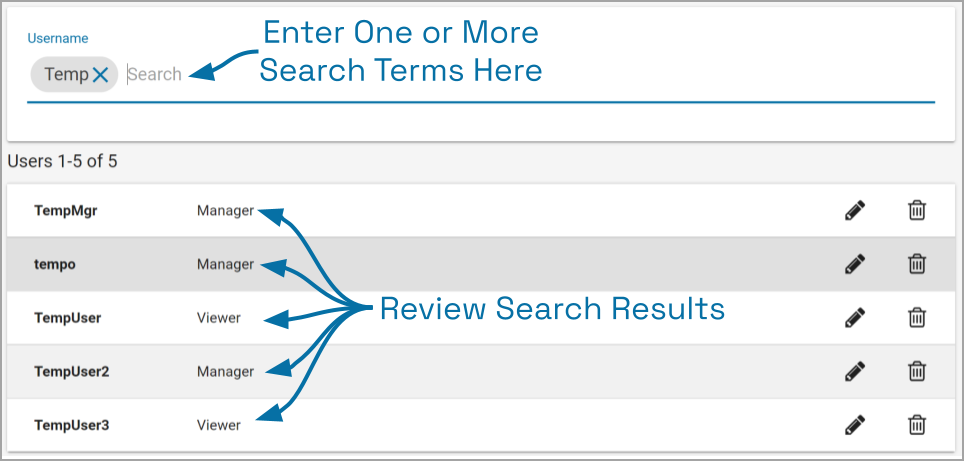 The Search field will appear at the top of the Users screen. It supports searching by usernames, using single and multiple search tags.