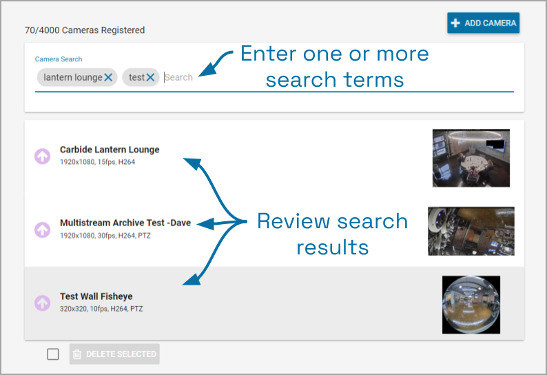 The Camera Search field will appear at the top of the Camera Configuration screen. It supports searching by the camera name, using single and multiple-word search tags.