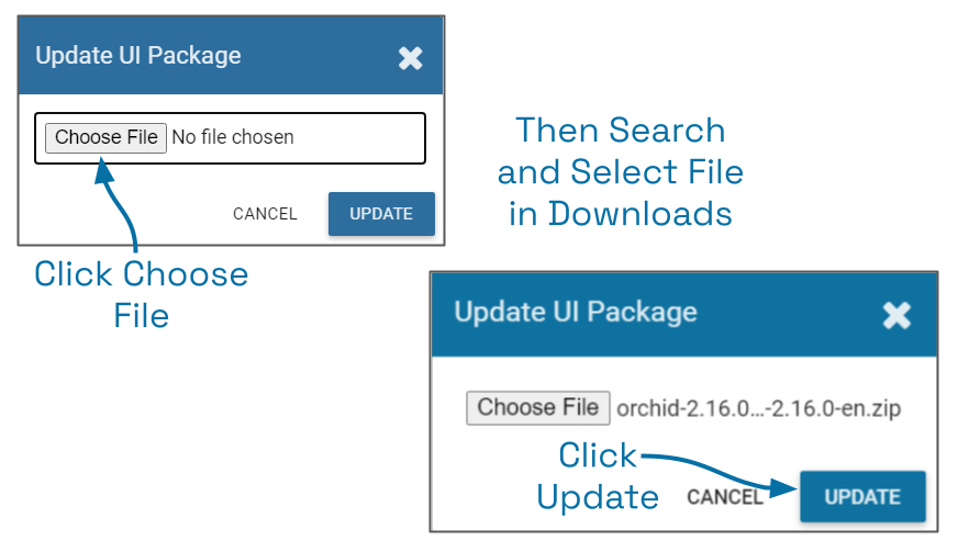The Update Client feature is used to select and apply a different UI Package file to the Orchid Core VMS client machine. This would allow for a quick and easy user interface update (without the need for a completely new installer).