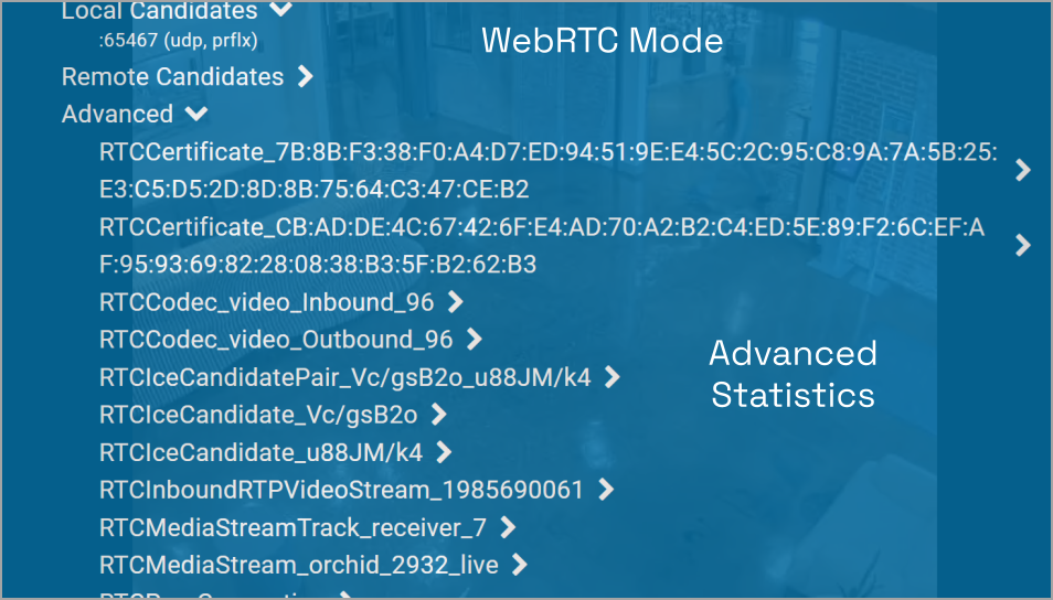 In WebRTC mode, Orchid Core VMS supplies not only the standard statistics (like those in Low-bandwidth mode), it also supplies WebRTC statistics. These statistics are available as an overlay on any Player and can be used in troubleshooting.