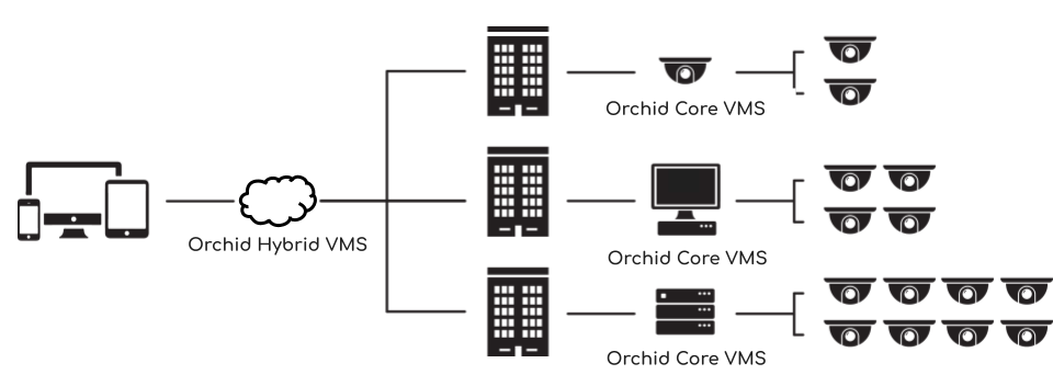servers and an Orchid Fusion VMS server to manage them. Orchid Hybrid VMS combines on-premise recording with cloud management. So while video is still stored on-site (on an Orchid server), the Hybrid system provides server aggregation, management, and accessibility through the cloud.