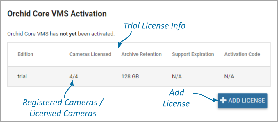 - When the Orchid Core VMS Activation screen appears, click the Add License button to activate a new license.