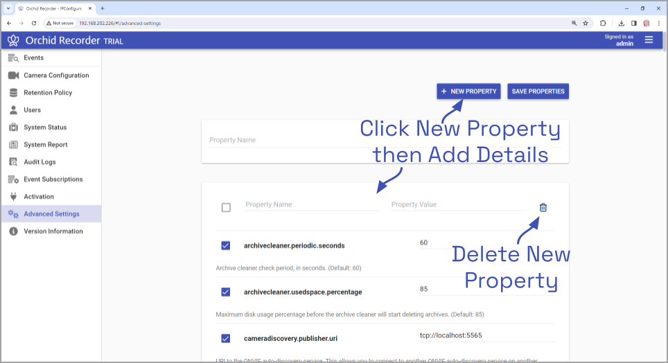 - If you decide not to add the new property, just click the Delete (Trash Can) icon.