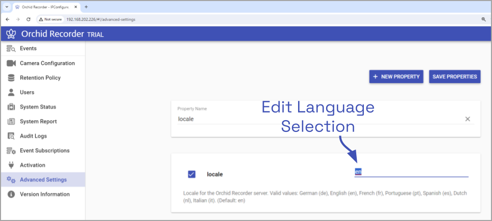 - Type in the two-letter language designation that represents the language you want to use. Orchid Recorder now supports the following languages: de (German), en (English), es (Spanish), fr (French), it (Italian), nl (Dutch), pt (Portuguese), and ru (Russian).