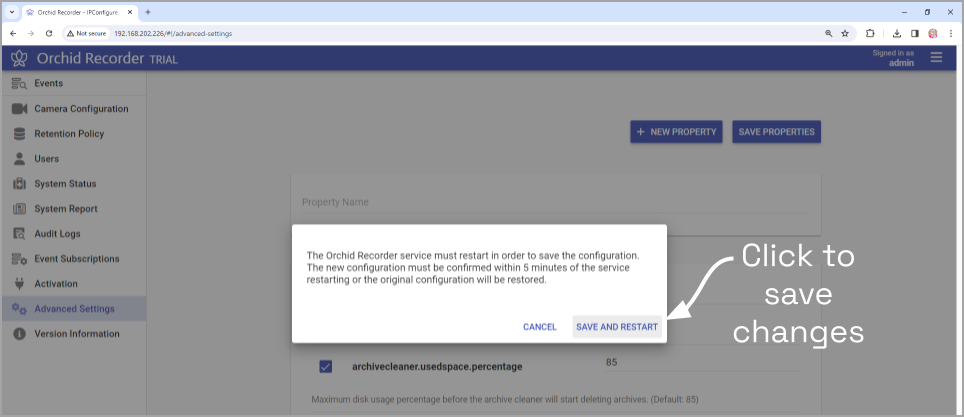 - To save changes, click the Save Properties button. You’ll receive a message that asks you to confirm changes and begin the restart.