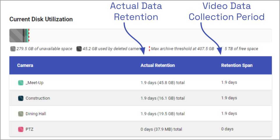 The Actual Retention column shows how many days worth of video is being stored per camera. It also includes how much disk space each camera is consuming. The Retention Span column shows the number of days over which the video files have been recorded. This data point is especially helpful for those cameras that are set to record only when motion is detected. (For example, look at the “dewarp” camera above. At first glance, the actual retention reading might cause concern. The Retention Span confirms that the system has been monitoring the camera for about the same amount of time as the other cameras.)