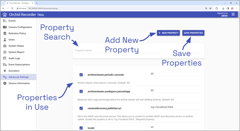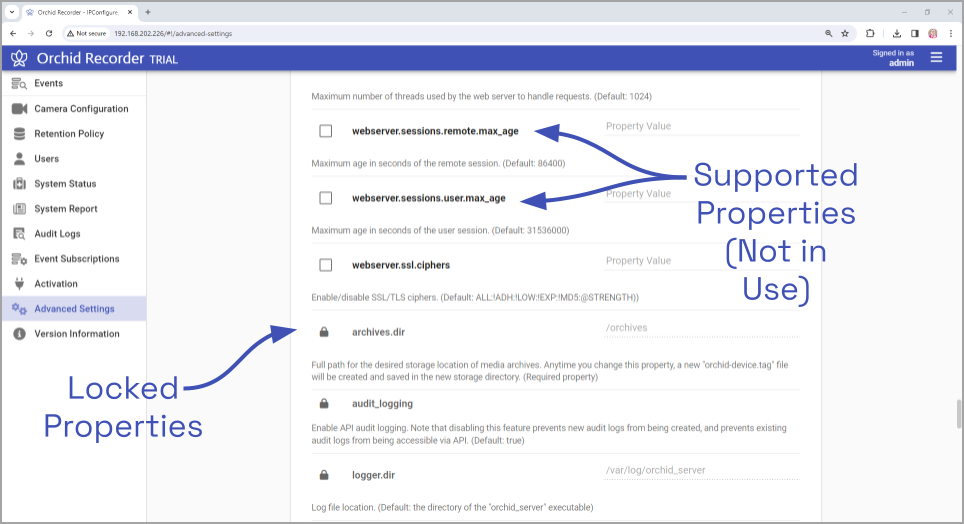 For details on how to edit the locked properties, please refer to the How to Edit a Configuration File section (for the appropriate operating system), and the Orchid Recorder Configuration Settings section (both of which are in the Orchid Recorder Installation Guide).