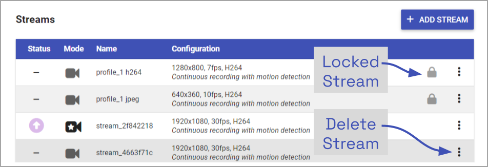 - To remove a single camera stream, go to the Streams List for a given camera and identify the stream you want to delete.