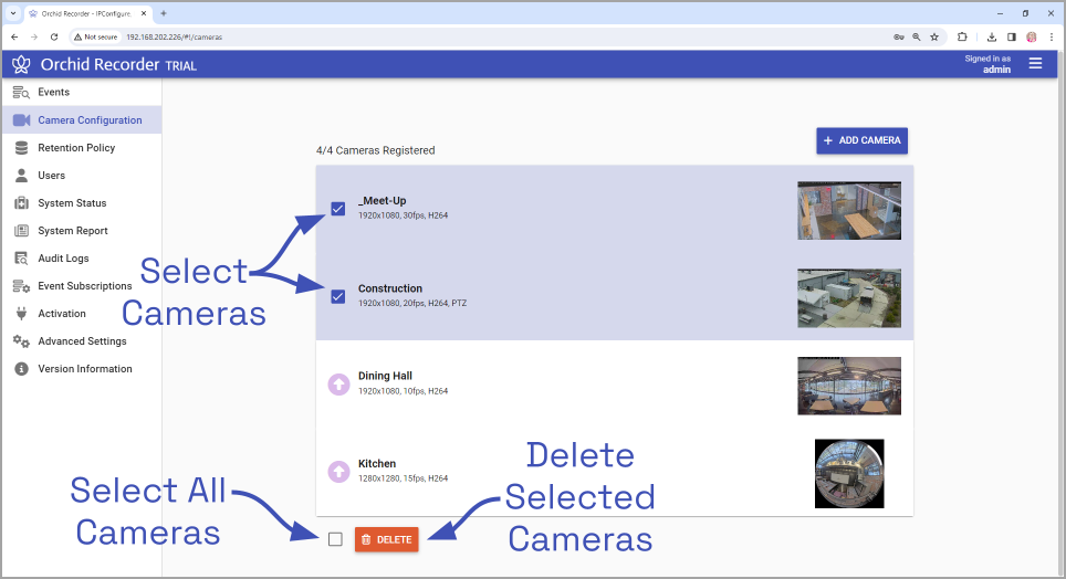 Multiple cameras can be removed from Orchid Recorder at the same time, if needed.