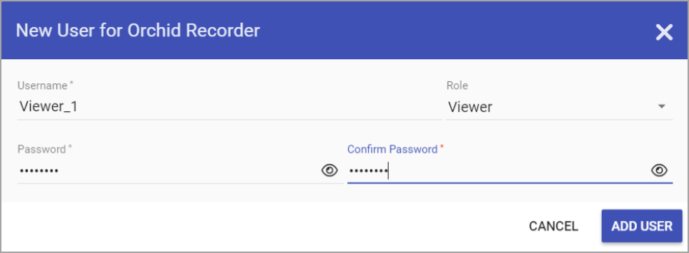 - Click the Add User button in the top-right corner of the Orchid Recorder Users screen.