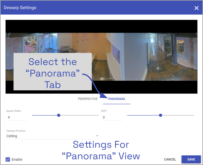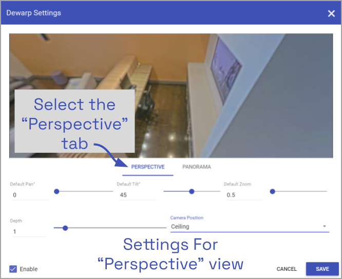 - Mark the Enable checkbox to activate the Dewarp Settings (both Perspective and Panorama) for this camera. (If this is not marked, Dewarping features will not be available at the Player.)