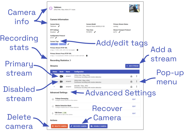 After a camera has been added to Orchid Recorder, settings such as the stream resolution and frame rate can be updated through the camera stream’s configuration. While this is true for most cameras, cameras added using the RTSP driver (old cameras and cameras that don’t support ONVIF) cannot be edited through Orchid Recorder. You will need to access those cameras directly to edit settings. (Refer to the camera manufacturer’s documentation for more details.)