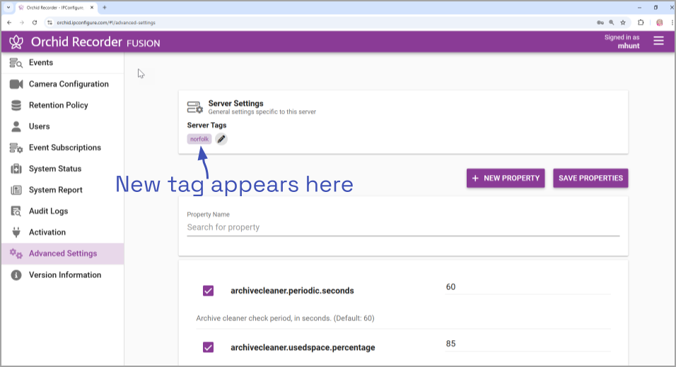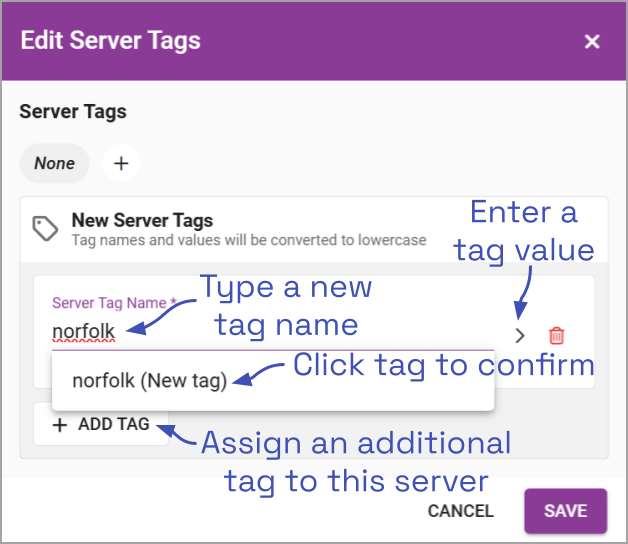 - To add a new tag to the system, click into the Server tag name field.