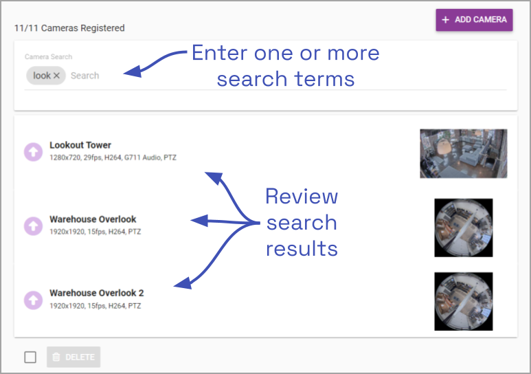 The Camera Search field will appear at the top of the Camera Configuration screen. It supports searching by the camera name, using single and multiple-word search tags.