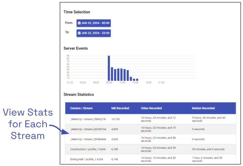 The Stream Statistics section lists each of the active camera streams in Orchid Recorder. For each stream, Orchid Recorder will show how many megabytes of video was recorded, the length of the recorded video, and how much of the recorded video contained motion. (The motion reported here will include both server-based and camera-based motion detection. Keep in mind, however, that server-based motion detection may be further defined using the advanced Motion Detection settings.)