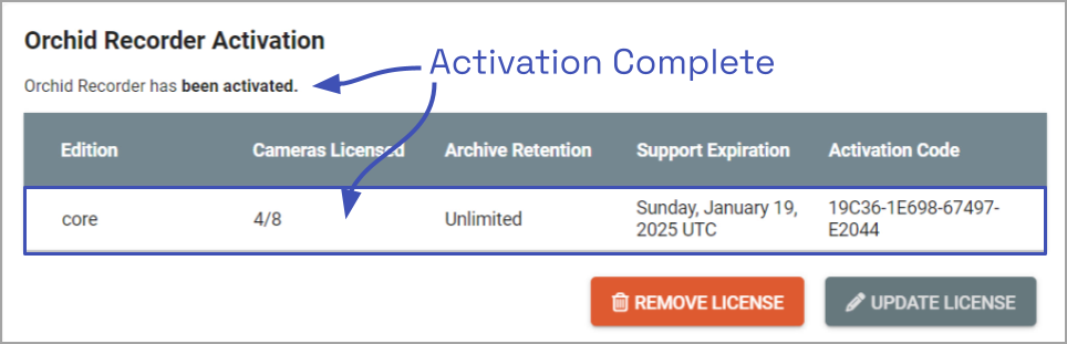 - Click the Activate button to generate your new Orchid Recorder license. If the license creation is successful, a screen will appear that indicates success.