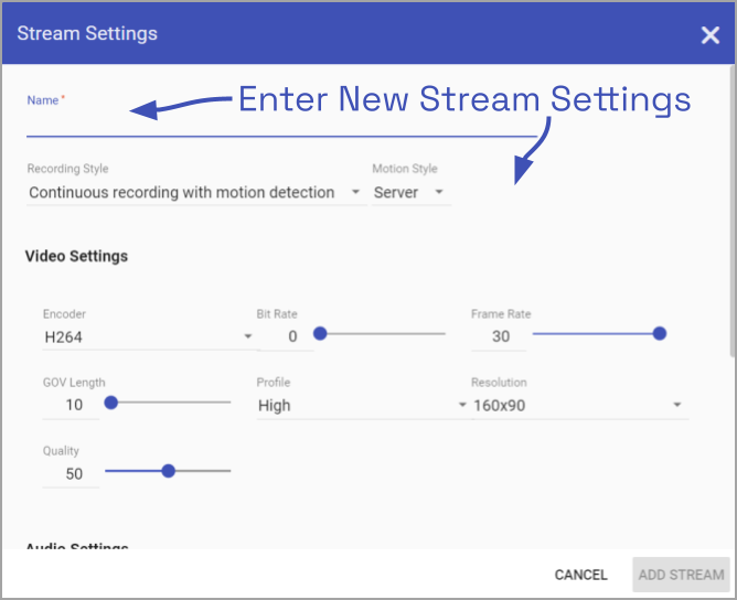 - When all settings have been entered, press the Add Stream button to add the new profile to the Streams list for the selected camera.