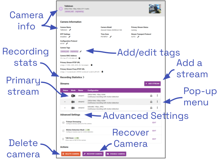 - From the list of registered cameras on the Camera Configuration screen, click the name of the camera you want to edit. (The list will expand to display all of the information for the selected camera. This includes the camera name, IP address, and all of the available streams.)