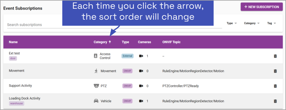 - Type: This option will sort the list by subscription type (ONVIF or External).