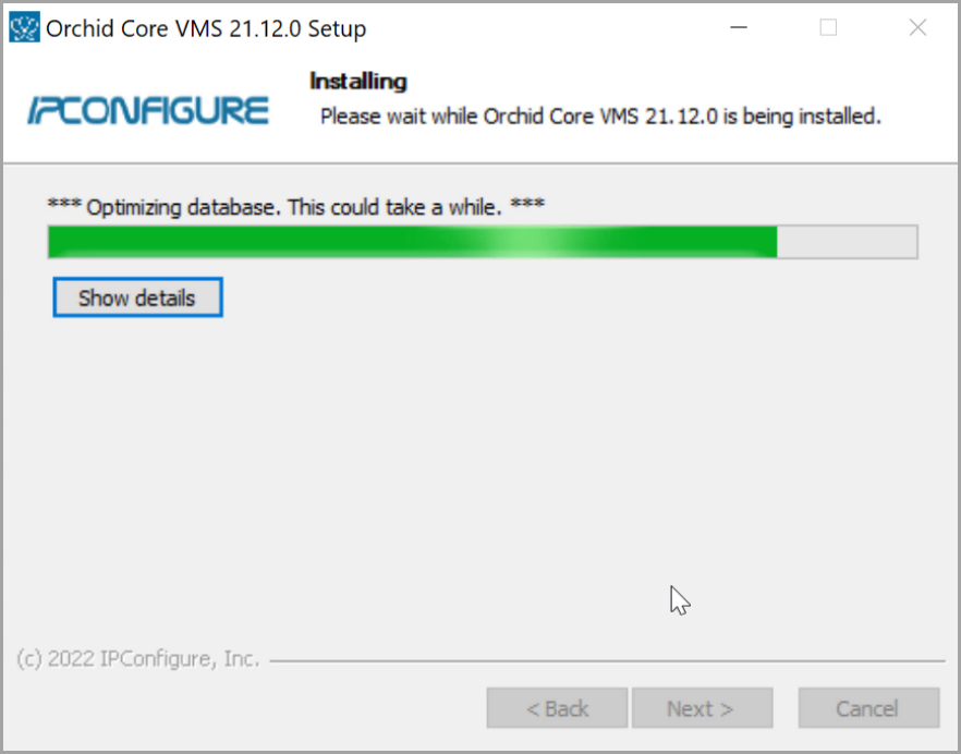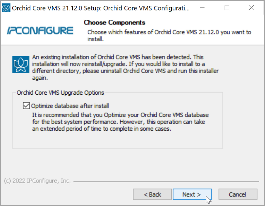 - If this is a software upgrade, the next screen will give you the opportunity to optimize the database. Optimization is recommended (since it will improve the overall performance of the system, especially notable in larger systems with video retentions greater than 40 TB). Be aware, however, that the optimization process may take a while to complete (and Orchid Core VMS will be unavailable during this time).