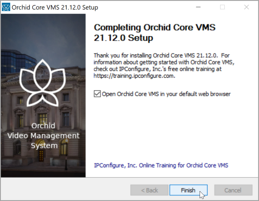 - Click the Finish button to close the installer. Orchid Core VMS will automatically open in the computer’s default web browser (if so marked).