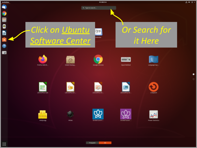 - Click on the Ubuntu Software Center icon, or use the Applications screen to search for it, then open it.