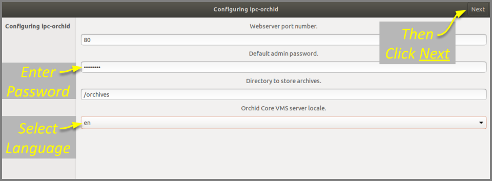 - Next, the installer will ask you to set the Web Server Port, default Admin Password, and the Archive Directory for storage. You will also have an opportunity to select the language for the user interface.