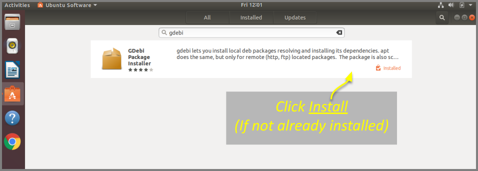 - Select GDebi Package Installer (gdebi) (which should be the first result), and then click the Install button (if it is not already installed).
