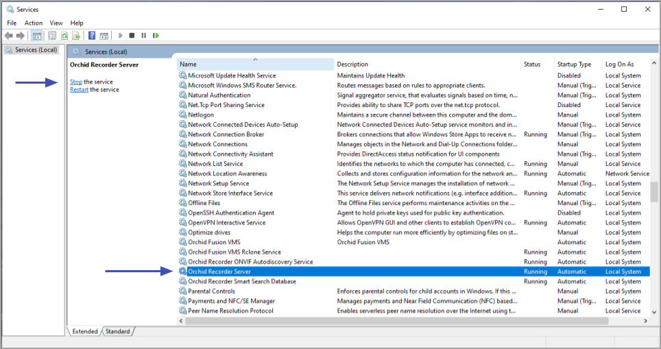 The two services listed below are used by Orchid Recorder on Windows. If you need to check the status, start, or stop one of these services, you can do this through the Services Manager whenever necessary. (You will need to restart the appropriate service whenever a change has been made to one of Orchid Recorder’s configuration files.)