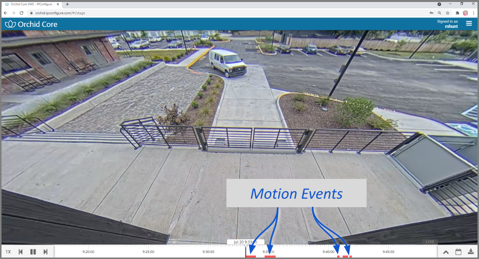 A motion event will occur when the system detects movement in the video (using either camera-based motion detection or server-based motion detection). When this happens, the software marks the event on the Timeline Bar with a red bar. This bar will remain on the Timeline Bar as long as the motion continues.