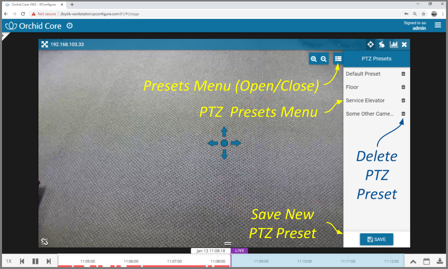 - To add a new preset, first use the pan, tilt, and zoom controls to situate the camera in the desired position. Then click the Save button. Enter a unique name for the new preset, then click the Save button again.