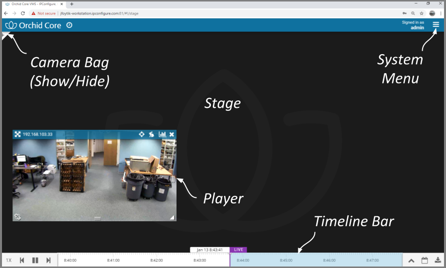 After you sign in, Orchid Core VMS will open at the Stage screen. This is the main viewing area in Orchid Core VMS and includes access to the Camera Bag, Timeline Bar (if your user permissions allow), and the System Menu. Orchid Core VMS automatically resizes itself for different sized screens and resolutions, so you will enjoy the same user interface on many devices like a desktop computer, tablet, mobile phone, etc.