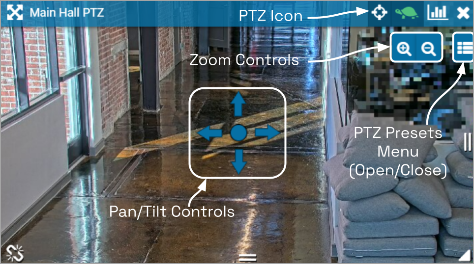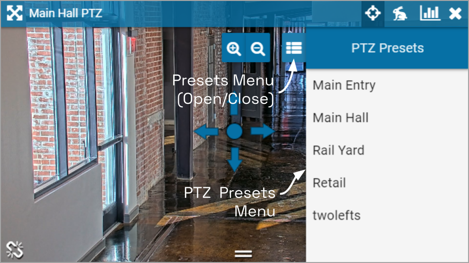 - Click on the PTZ icon in the header. (This icon will only be available if the camera supports pan-tilt-zoom.) This will activate the camera’s PTZ controls which will appear as an overlay on the Player. This will also activate the PTZ Presets Menu (if the camera supports presets).