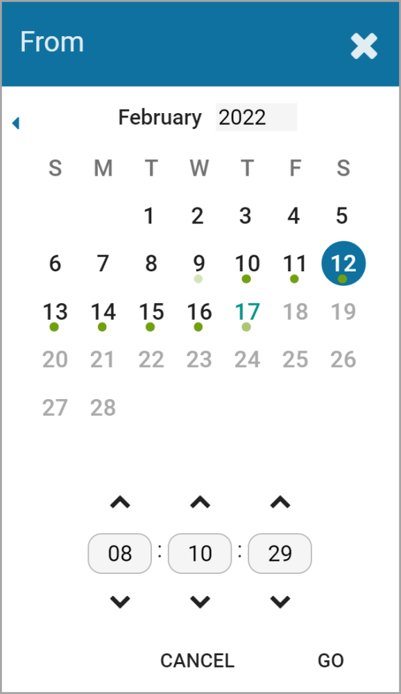 When the calendar opens, you have the ability to select the date and time for the starting point for your video export. Green dots (underneath each date) indicate that video is available for one or more of the cameras on the Stage.