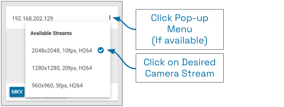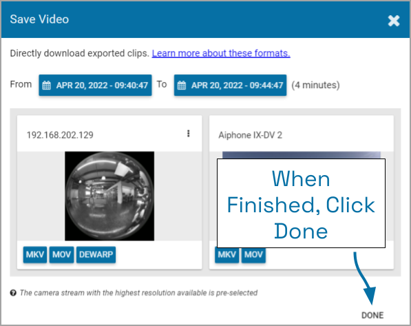 - You may have the option to select a specific stream for the export. Click on the pop-up menu (if available), then click on the stream resolution you want to export. (The system will automatically select the highest resolution stream for the export unless you select a different stream here.)