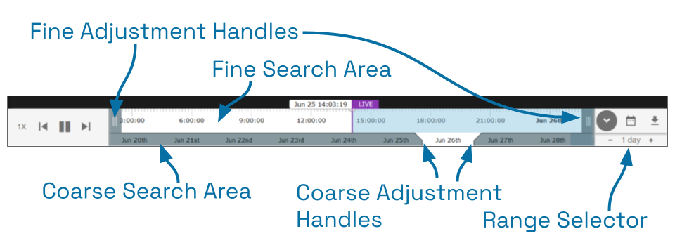 - Use the Range Selector to increase and decrease the Timeline Bar increments and amount of time displayed in the Coarse Search Area.