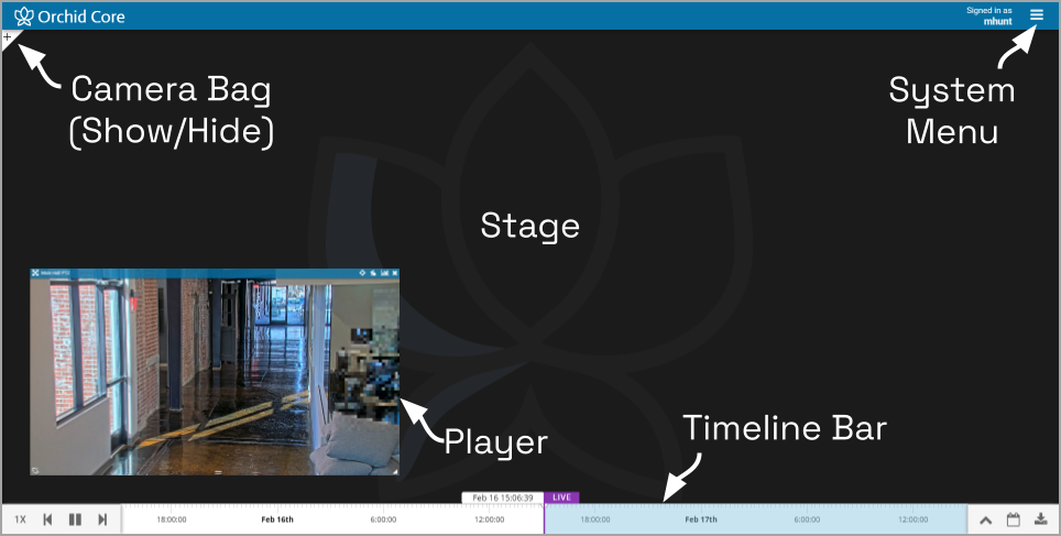 After you sign in, Orchid Core VMS will open at the Stage screen. This is the main viewing area in Orchid Core VMS and includes access to the Camera Bag, Timeline Bar (if your user permissions allow), and the System Menu. Orchid Core VMS automatically resizes itself for different sized screens and resolutions, so you will enjoy the same user interface on many devices like a desktop computer, tablet, mobile phone, etc.
