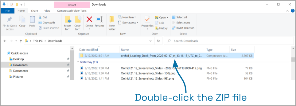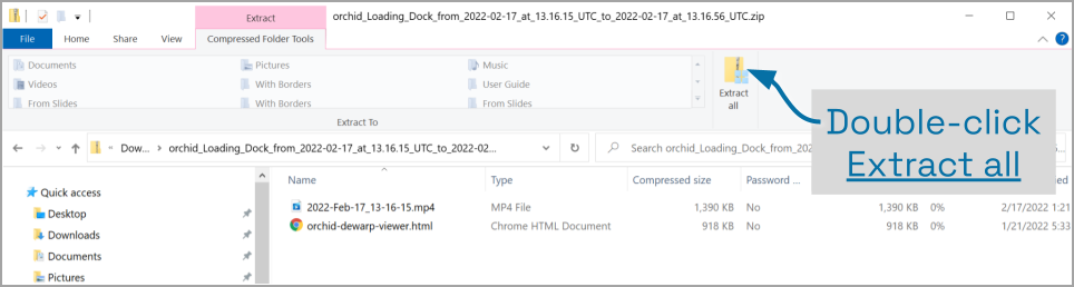 1. In the Downloads folder, look for a ZIP file. The exported video file name is based on the camera name and includes the event date and time in Coordinated Universal Time (UTC).