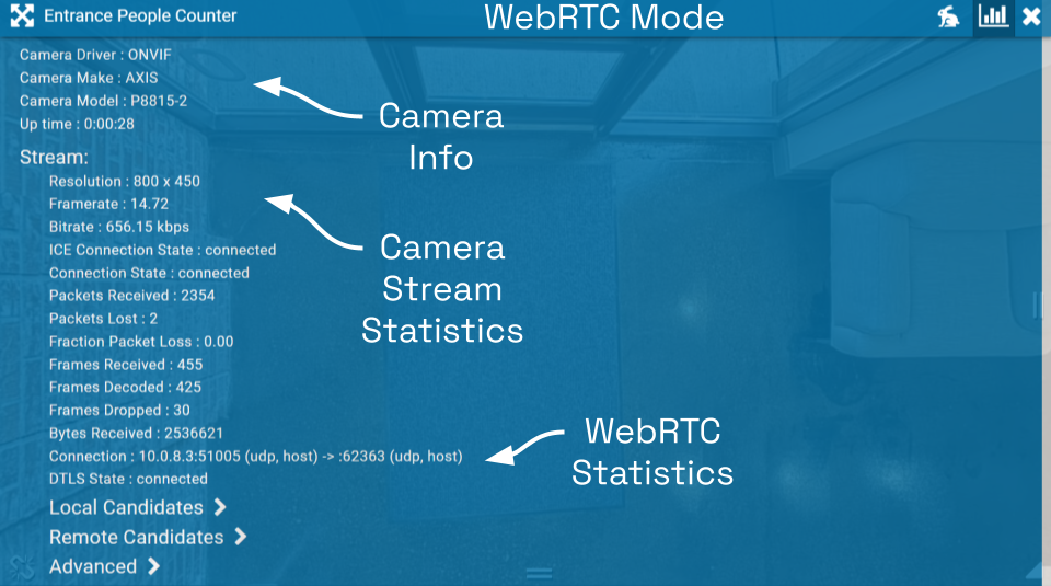 If you’re running Orchid Core VMS in WebRTC mode, in addition to providing details pertaining to the camera and video quality, the software will display a wealth of other statistics. (For more details, please refer to the Orchid Core VMS Administrator Guide.)