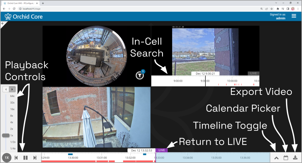 The Stage screen provides various options for viewing live and recorded video. These options, along with the availability of the Timeline Bar and the adjacent tools will vary depending on the permissions of the signed-in user.