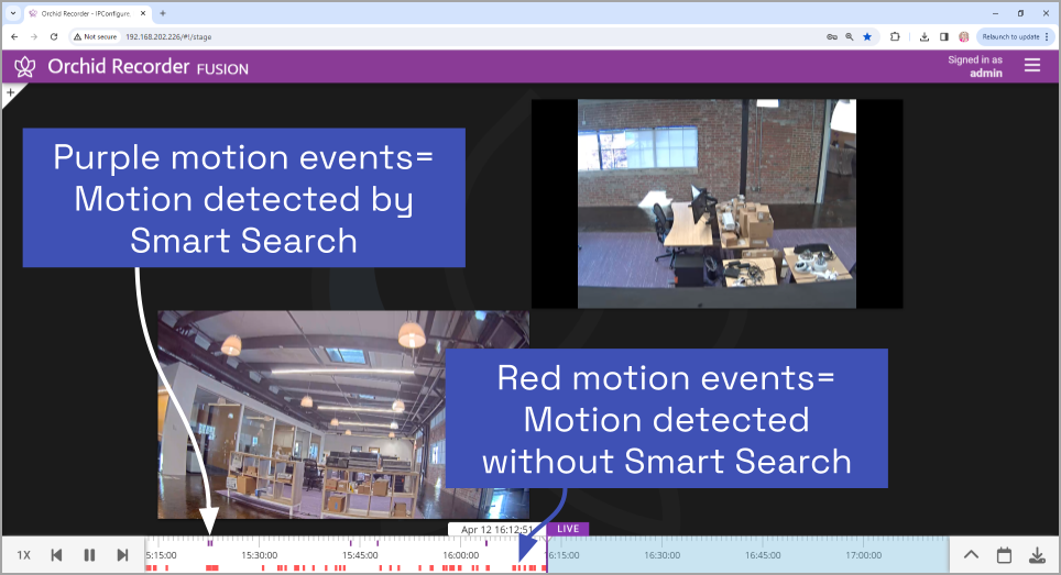 In the example below, the Smart Search motion events appear in purple along the top of the Timeline Bar (since the Recorder has a Fusion license).